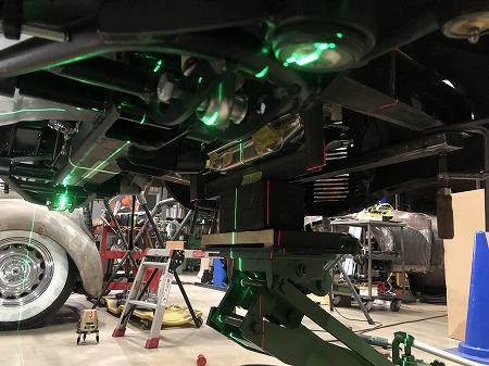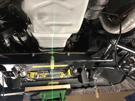 エンジン ルーム で  ミッション ジャッキ で 高さ を 合わせ
