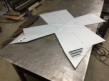 採寸 した 型紙 を もとに、  鉄板 を 切り出していき