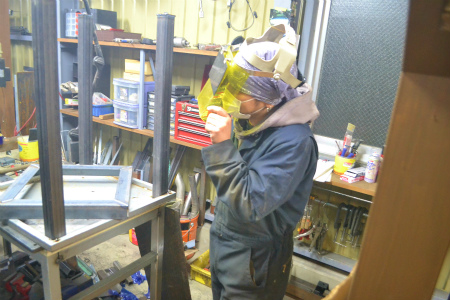 ホイール 修理用 の、 作業台 を 製作中 の