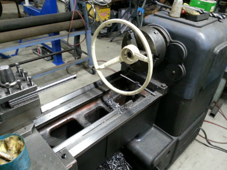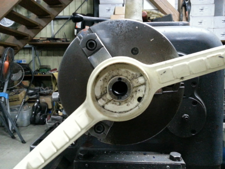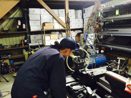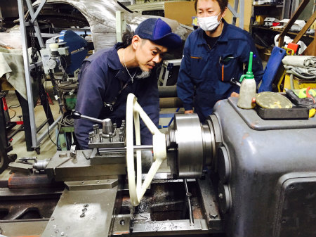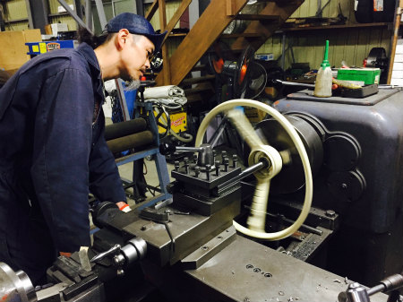 旋盤 で  芯 を  出しながら、  くりぬいて いきまして