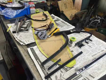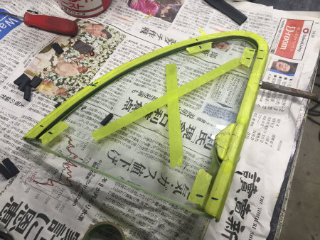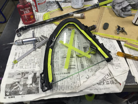 三角窓 フレーム に  製作 した  ガラス を  組む 際、