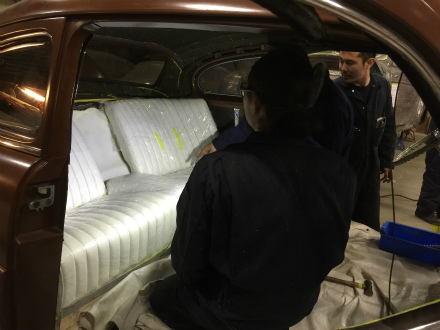 ホワイト の  タック & ロール で  張り替え が  終わっている