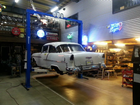 クルマ を  リフト で  持ち上げて