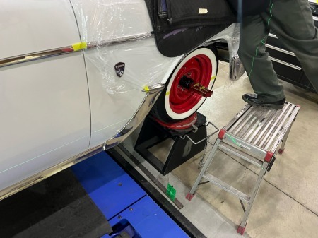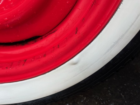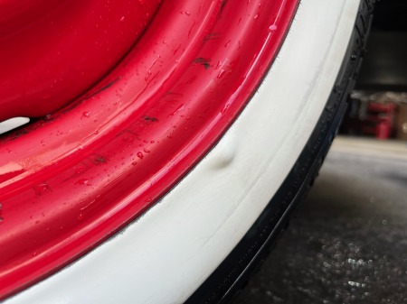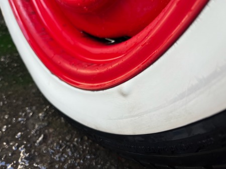 右前のタイヤのホワイトウォール部分に