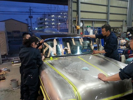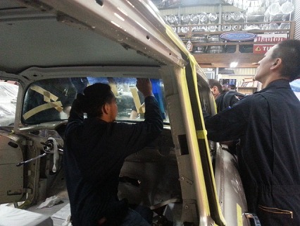 この日は、 ウインド シールド の 取り付け を してまして