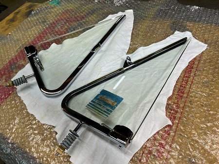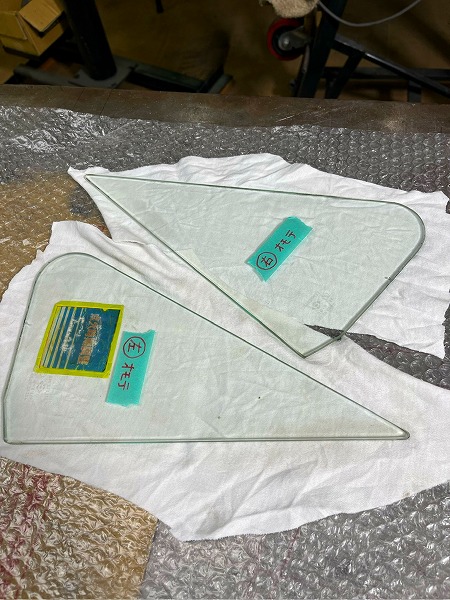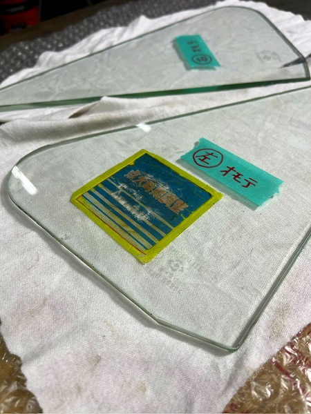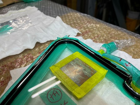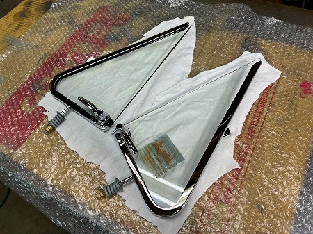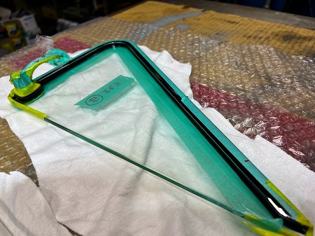 三角窓枠へのガラスの取り付けが完了