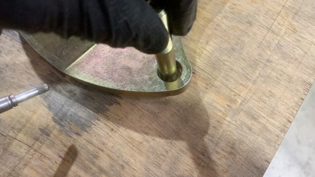 キャリパーブラケットの穴に対して、プレスで
