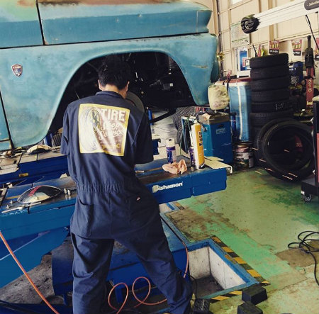 下に 潜って、 ギア ボックス を 外してる おとん が