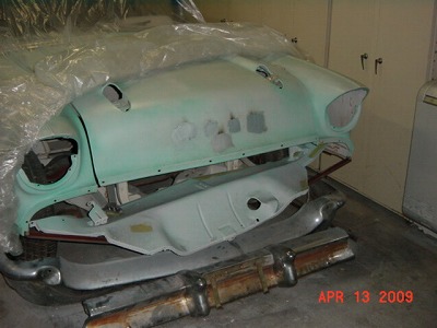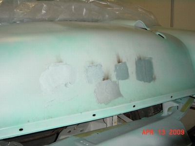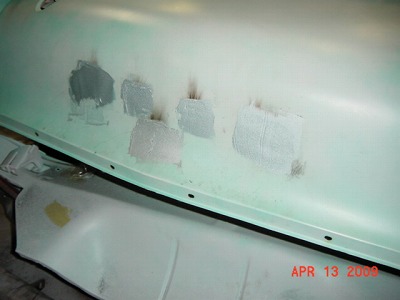 フロントフードの エンブレム用の 穴を溶接し、 アルミパテを 盛りました。