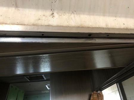 窓枠にぐちゃぐちゃになってのこっている、ブチルの