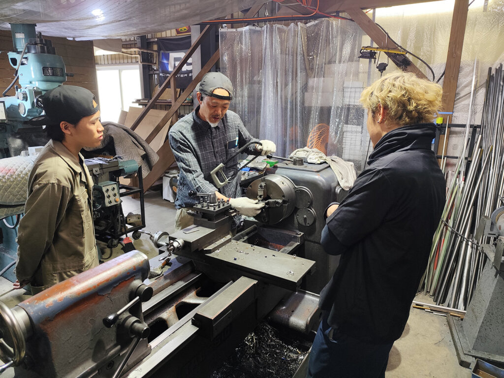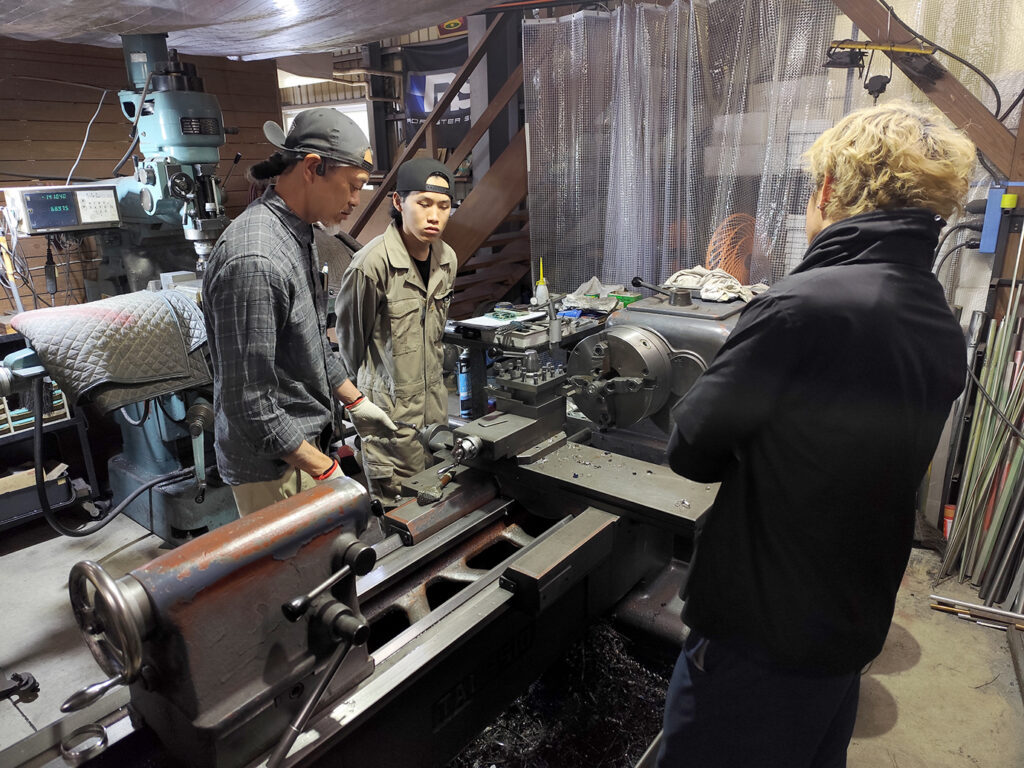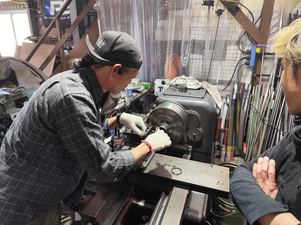 講習スタートに先駆け、練習材料の準備と併せて、一部のスタッフに対しては旋盤の取扱い講習もありました。