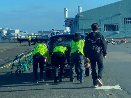 工具やバッテリーなどを積んだ車と