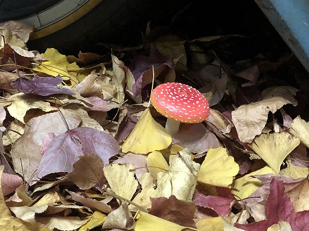枯れ葉 の ディスプレーの なかに キノコ を 忍ばせようと