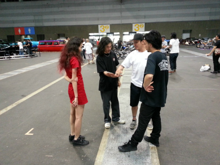 会場 の 外 の、 搬入待ち の 列 の 中 で