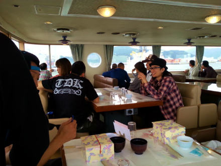 お昼 ご飯 は、   みんな で   遊覧船 に   乗りながら