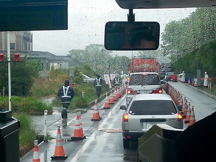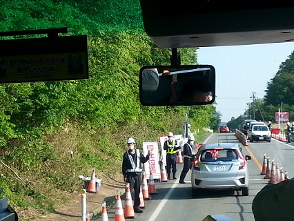 福島県 への、   ボランティア 行き の  バス に  乗り込みまして