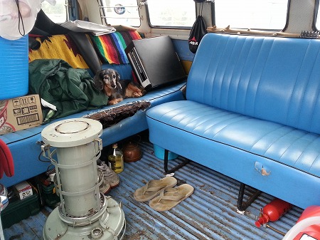 海 に 入ってる 間、  車内 で  犬 が 寝てるので