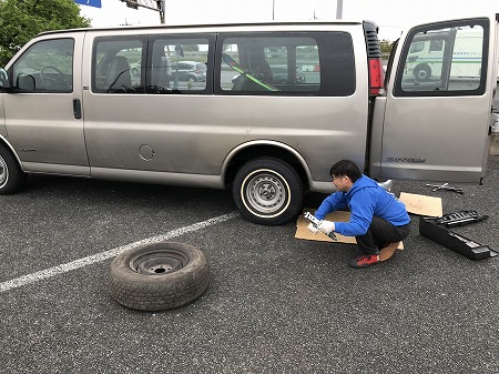料金所 で ジャッキ 借りてきて、 スペア タイヤ に 履き替えたら、