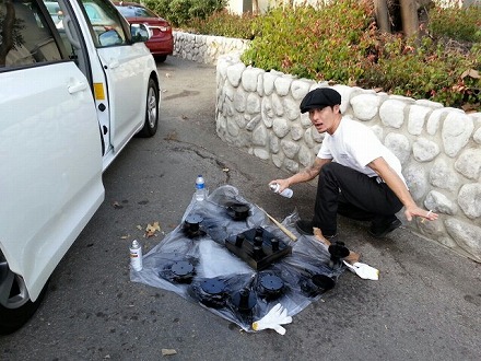 会場 に 着いてからも 塗っていた、 ポール スタンド は