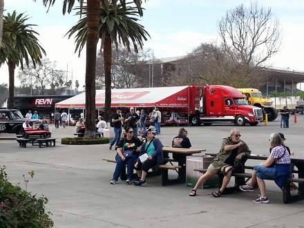 大きな 会場 で、  沢山 の  クルマ や  ブース を  見て  歩き回ったら、