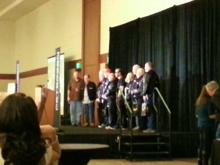 壇上 に  呼ばれ、    胸 に  それぞれの  名前 が  刺繍 された